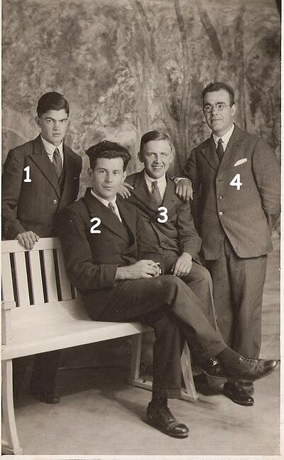 Vier jonge mannen uit het verleden poseren. Wie zijn het?